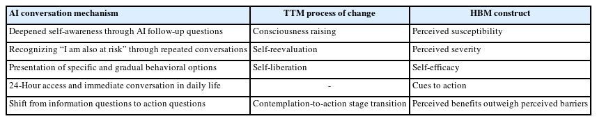 AI conversations can reinforce self-efficacy by strengthening the perception that “I can manage this.” When an AI chatbot proposes gradual, personalized goals—“Walking 10,000 steps a day might be difficult, but how about starting by walking to the convenience store?”—it creates the conditions for what Bandura [8] termed performance accomplishment, the most powerful source of self-efficacy. Cues to action are equally relevant: because AI conversations are available 24 hours a day, they can function as real-time prompts that encourage behavior “before lying on the sofa after work” or “in anxious moments at dawn.” This accessibility complements structural constraints of existing health promotion interventions, such as limited consultation hours and economic, geographic, or psychological barriers to counseling.