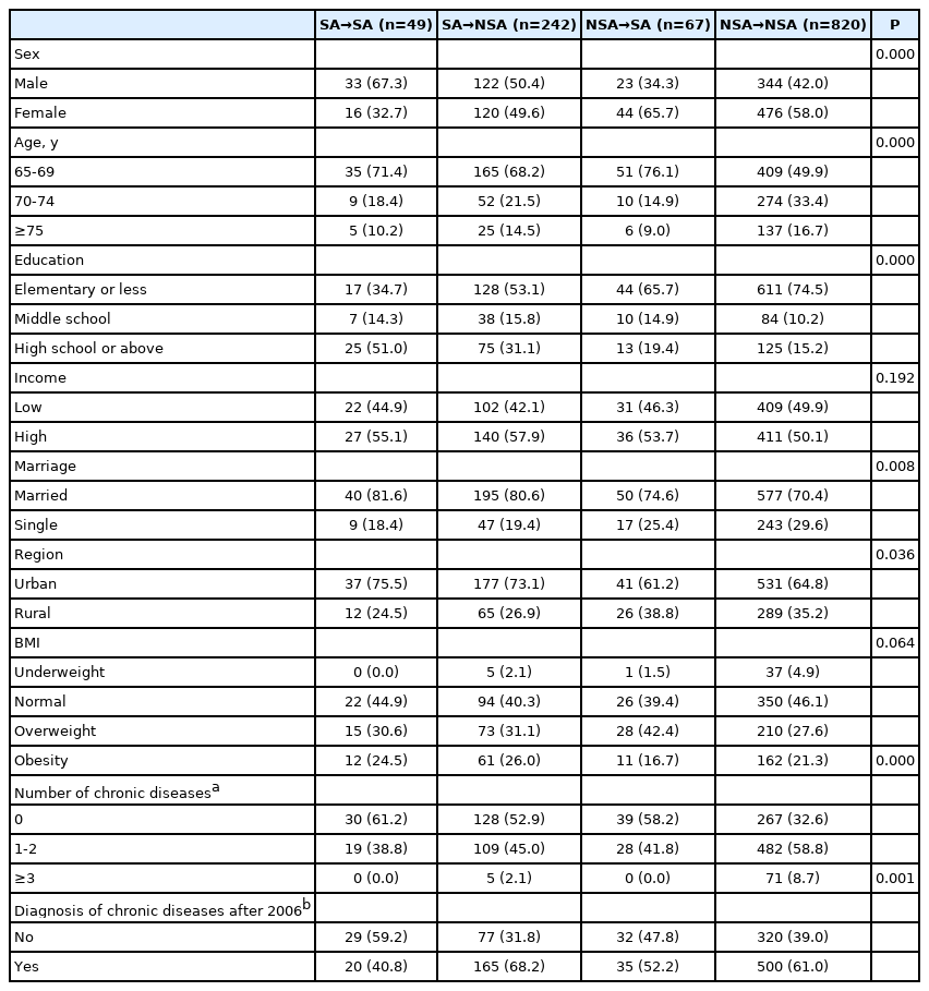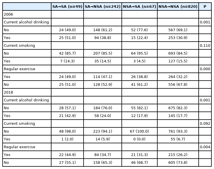Baseline sample characteristics of each group classified by 12-year-transition of SA are described in Table 1. Compared to other groups, those in SA→SA group were likely to be male, young, highly educated, and married. Living in urban and less cormorbidities were also related with ‘SA→SA’. In terms of health-related behaviors, the proportion of current smokers and performing regular exercise were highest in SA →SA group, at the year of 2006 and 2018 (Table 2).