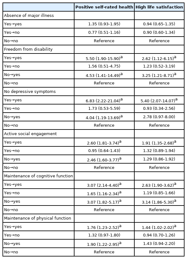 Table 4 describes the association of 12-year change in each component of SA status with positive self-rated health and high life satisfaction. All components except ‘absence of major illness’ were significantly related with both self-rated health and life satisfaction. ‘No depressive symptom’, ‘freedom from disability’, and ‘maintenance of cognitive function’ showed greater OR than other domains, both in positive self-rated health and high life satisfaction.