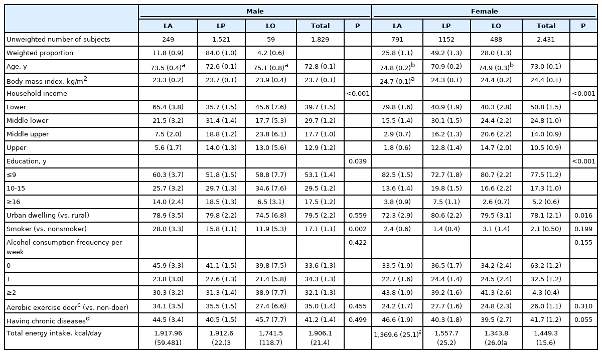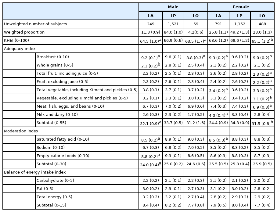 남성 노인에서 LA군, LP군, LO군의 KHEI는 각각 64.5 (SE, 1.0), 66.9 (SE, 0.6), 63.5 (SE, 1.7)였다. 가장 KHEI가 높은 LP군과 비교하여, LA군(P<0.05)과 LO군(P<0.05) 모두 KHEI가 의미 있게 낮았다. 반면, 여성 노인에서는 LA군의 KHEI는 68.6 (SE, 1.2)로 LP군의 68.6 (SE, 1.2)와는 차이를 보이지 않았으나, LO군의 경우는 65.1 (SE, 1.2)로 LP군보다 의미 있게 낮았다(P<0.001) (Table 2).