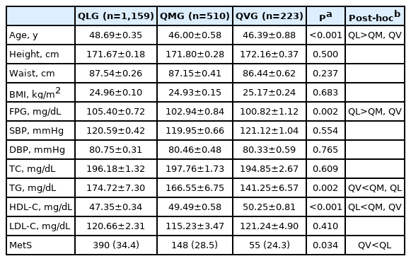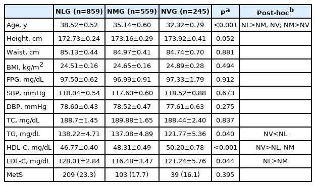This study used the National Cholesterol Education Program Adult Treatment Panel III clinical diagnostic criteria for MetS. For abdominal obesity, the Korean Society for the Study of Obesity's criteria for Korean adults were employed [17]. MetS was diagnosed if participants had three or more of the five symptoms: waist circumference ≥90 cm in men, triglyceride (TG) levels ≥150 mg/dL or under-treatment for increased triglyceride levels, fasting plasma glucose (FPG) levels ≥100 mg/dL or under-treatment for diabetes, high-density lipoprotein cholesterol (HDL-C) levels <40 mg/dL in men or under-treatment for reduced HDL-C, blood pressure ≥130/85 mmHg or use of antihypertensives.