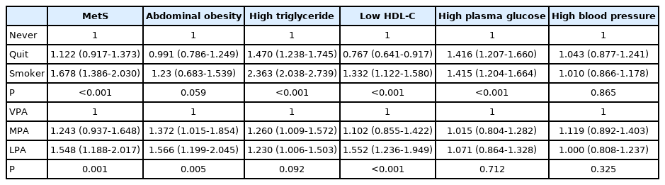 성인 남성에서 MetS 유병률은 27.8%로 나타났다. 흡연과 LPA의 증가는 MetS의 발병 위험을 증가시키는 것으로 밝혀졌다. MetS의 위험은 VPA와 quitter군에서 LPA와 흡연군에 비하여 64.7% 유의하게 감소하였다(교차비, 0.35; 95% 신뢰구간, 0.23-0.53).