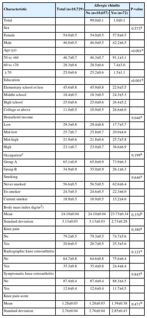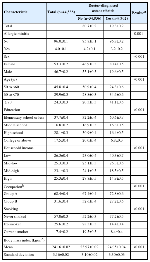 The demographic, socioeconomic, and clinical characteristics of study population 1 are summarized in Table 1. The frequency of allergic rhinitis was lower in subjects with doctor-diagnosed osteoarthritis than in those without it (proportion±standard error, 3.2%±0.2% vs. 4.2%±0.1%; P=0.001).