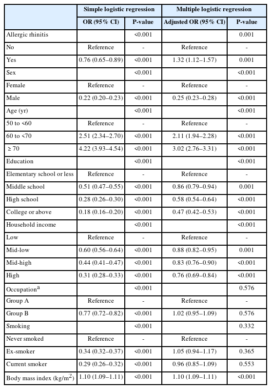 To estimate odds ratios (ORs) of doctor-diagnosed osteoarthritis according to allergic rhinitis in study population 1, simple and multiple logistic regression analyses were performed. The multiple logistic regression model included potential confounding variables such as sex, age, education, household income, occupation, smoking, and body mass index.