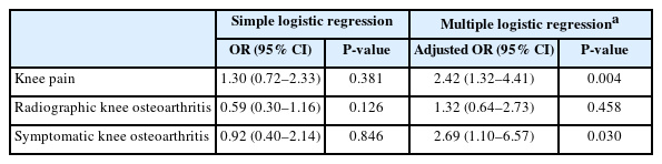 To estimate ORs of knee pain, radiographic knee osteoarthritis, and symptomatic knee osteoarthritis according to allergic rhinitis in study population 2, simple and multiple logistic regression analyses were also conducted. The multiple logistic regression models included the same confounding variables as those used in study population 1.