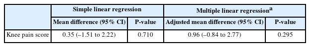 To estimate the mean knee pain scores according to allergic rhinitis in subjects with radiographic knee osteoarthritis, simple and multiple linear regression analyses were conducted. The multiple linear regression models included the same confounding variables as those used in the multiple logistic regression models.