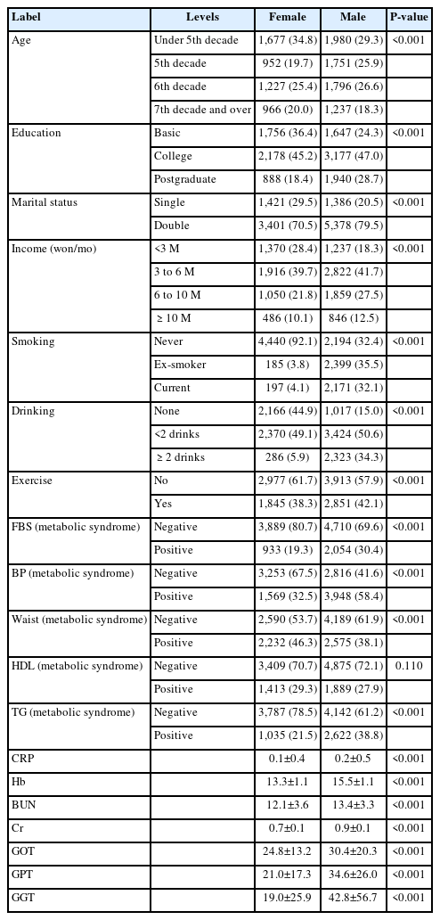 Table 1 presents an analysis and description of the characteristics of the study subjects. The majority of the participants were under the age of 50, and a significant proportion held college degrees. Sex differences were also observed. Males were more likely to smoke, consume alcohol, and exhibit greater blood pressure than females. Additionally, differences were noted in liver function test results between males and females.