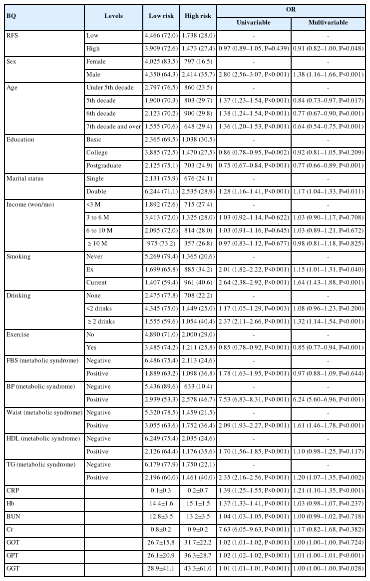 Table 2 shows the associations between various variables, including the RFS (odds ratio [OR]=0.91 [95% confidence interval, 0.82–1.00, P=0.048]), sex, age, education, marital status, income, smoking status, alcohol consumption status, exercise status, fasting blood sugar, and blood pressure, and the BQ score in the low- and high-risk categories. ORs are provided for both univariable and multivariable analyses.