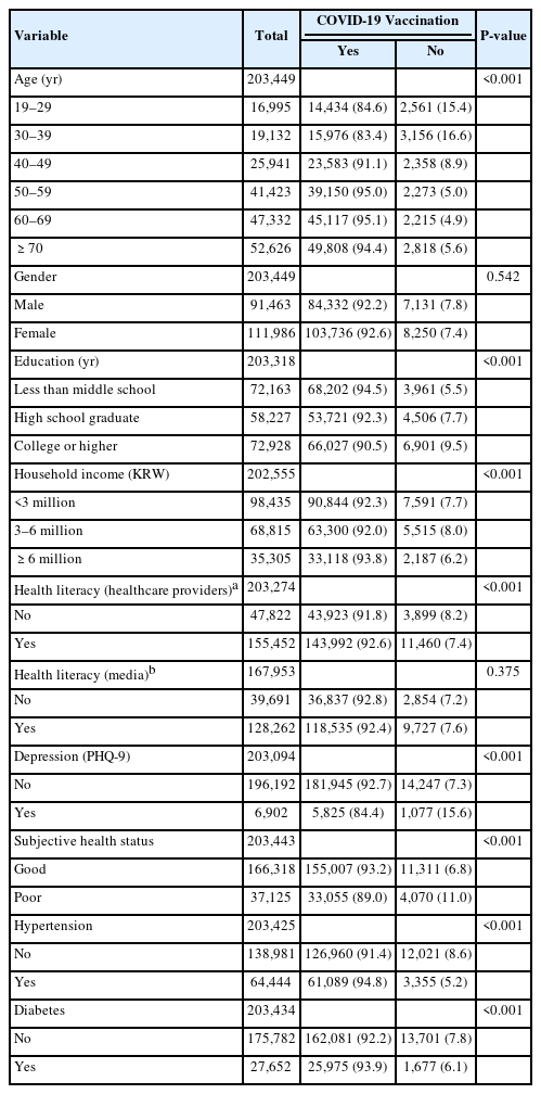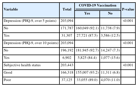 Analysis included 203,449 individuals, excluding those who had not received or were ineligible for the COVID-19 vaccine, based on the 2021 Community Health Survey. The chi-square tests assessed sociodemographic and health status differences related to vaccination status. Subjective health status was categorized based on survey responses as ‘good’ or ‘poor,’ and depression was assessed using the self-reported Patient Health Questionnaire-9. The association between depression, subjective health status, and vaccination status was examined using chi-square tests, followed by multiple logistic regression to determine independent effects.