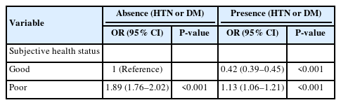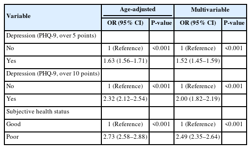 The individual health status variables used in this study included subjective health status, depression, and morbidity (hypertension, diabetes). Subjective health status was reclassified from the survey items, with ‘very good,’ ‘good,’ and ‘fair’ being categorized as good subjective health status, and ‘poor’ and ‘very poor’ being categorized as poor subjective health status. For depression, the Patient Health Questionnaire-9 (PHQ-9), a self-reported survey consisting of nine items that correspond to the diagnostic criteria for major depressive disorder, was used from the survey items [12]. A score of 10 or higher, which indicates moderate depression, was defined as having depression, while a score of less than 10 was defined as not having depression.